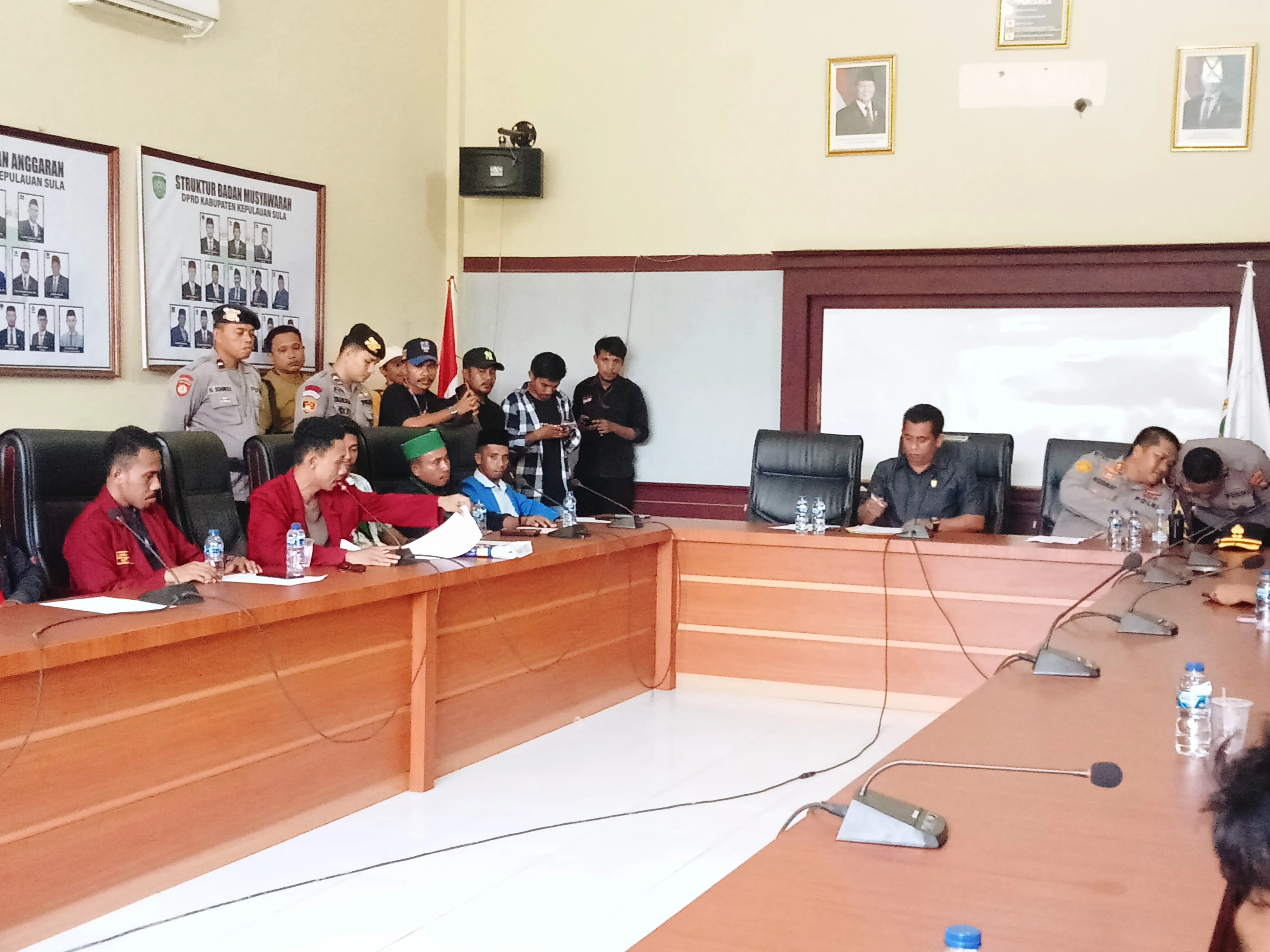 Setelah menyampaikan orasi di depan kantor dewan, massa aksi kemudian diterima dalam forum hearing oleh Ketua DPRD Kepulauan Sula, Hi. Ahkam Gajali.